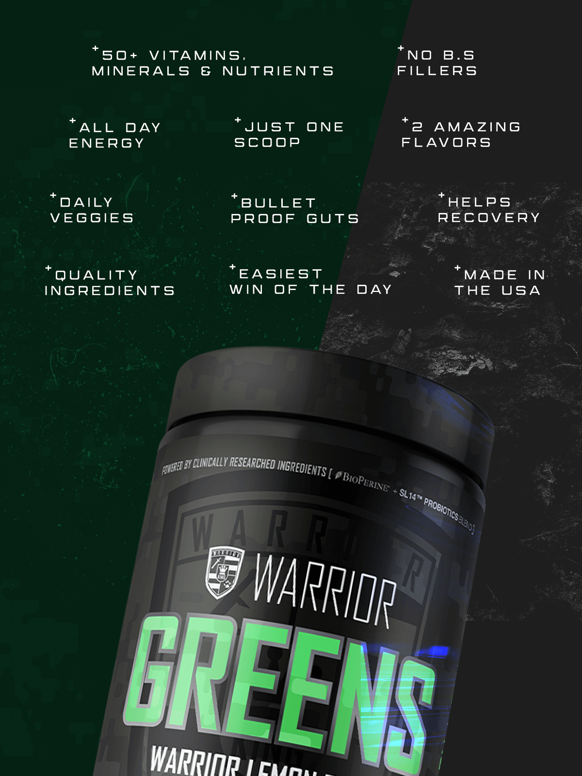 Introducing Warrior Greens: The Best Tasting Superfood Supplement On The Planet. Simplify your morning routine with just one scoop. Jam-packed with over 50 high-quality vitamins, minerals, and nutrients that are clinically dosed to support your energy, immunity, gut health, and overall performance.