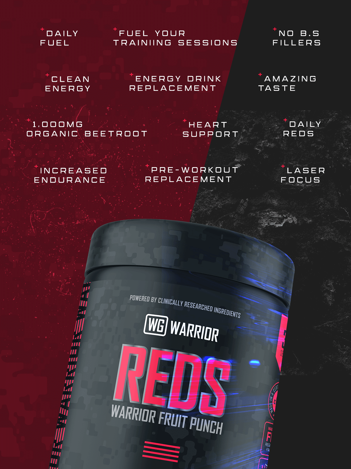 Introducing Warrior Reds: The healthiest replacement for energy drinks and pre-workouts on planet earth. Jam packed with Organic Beetroot, strawberry, pomegranate, cherry, raspberry, Alpha-GPC, and natural caffeine, this superfood supplement is guaranteed to give you clean energy and unlimited focus.